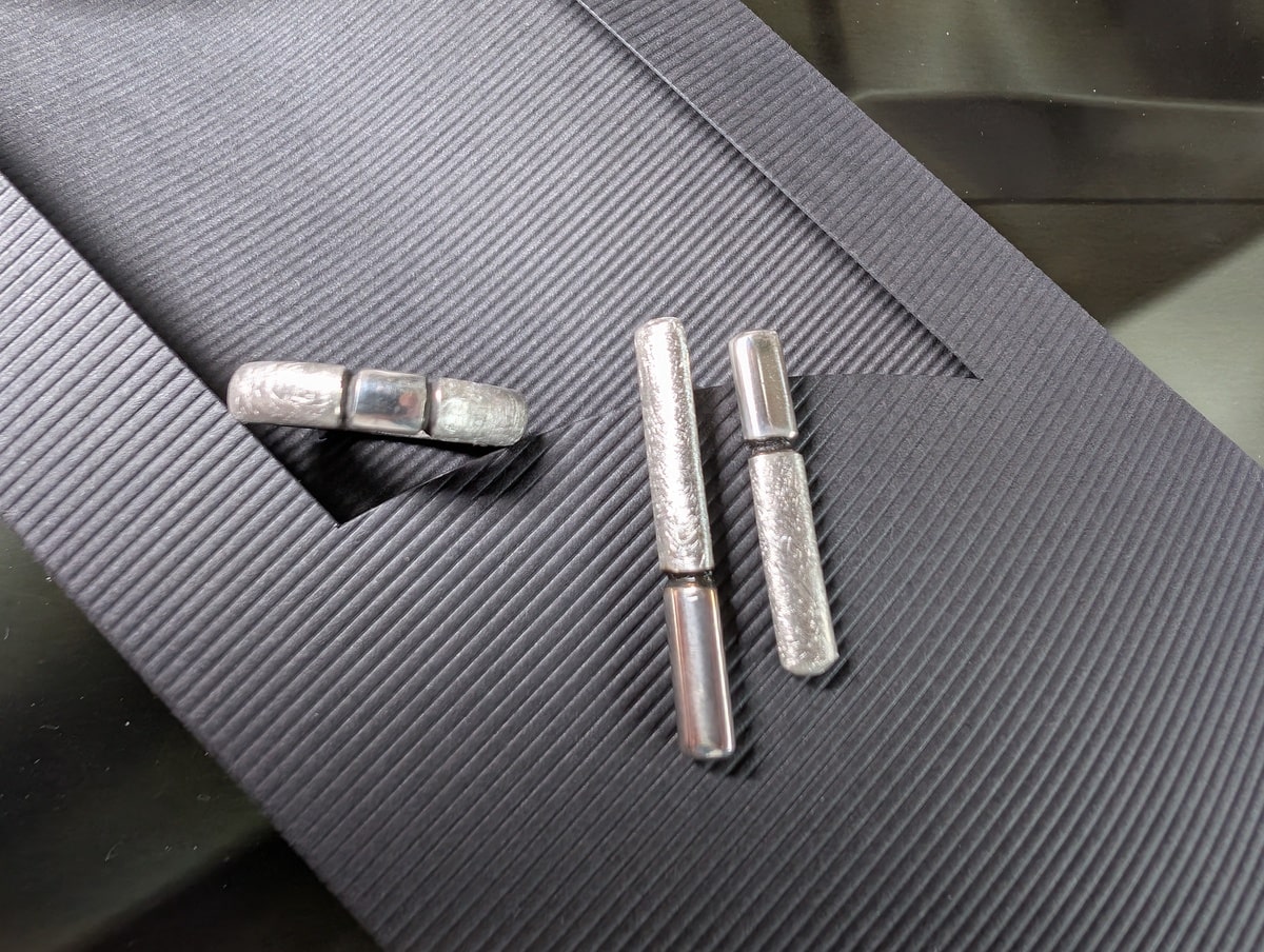 Creating contrast on silver jewelry is one of the simplest yet most effective techniques to achieve a striking visual effect. The pieces shown—a ring and matching earrings—demonstrate how matte textures and high-gloss polishing can be combined to bring depth and sophistication to curved surfaces. By introducing a subtle dark separation line between the two finishes, the design becomes even more defined, enhancing the play of light across the metal.
