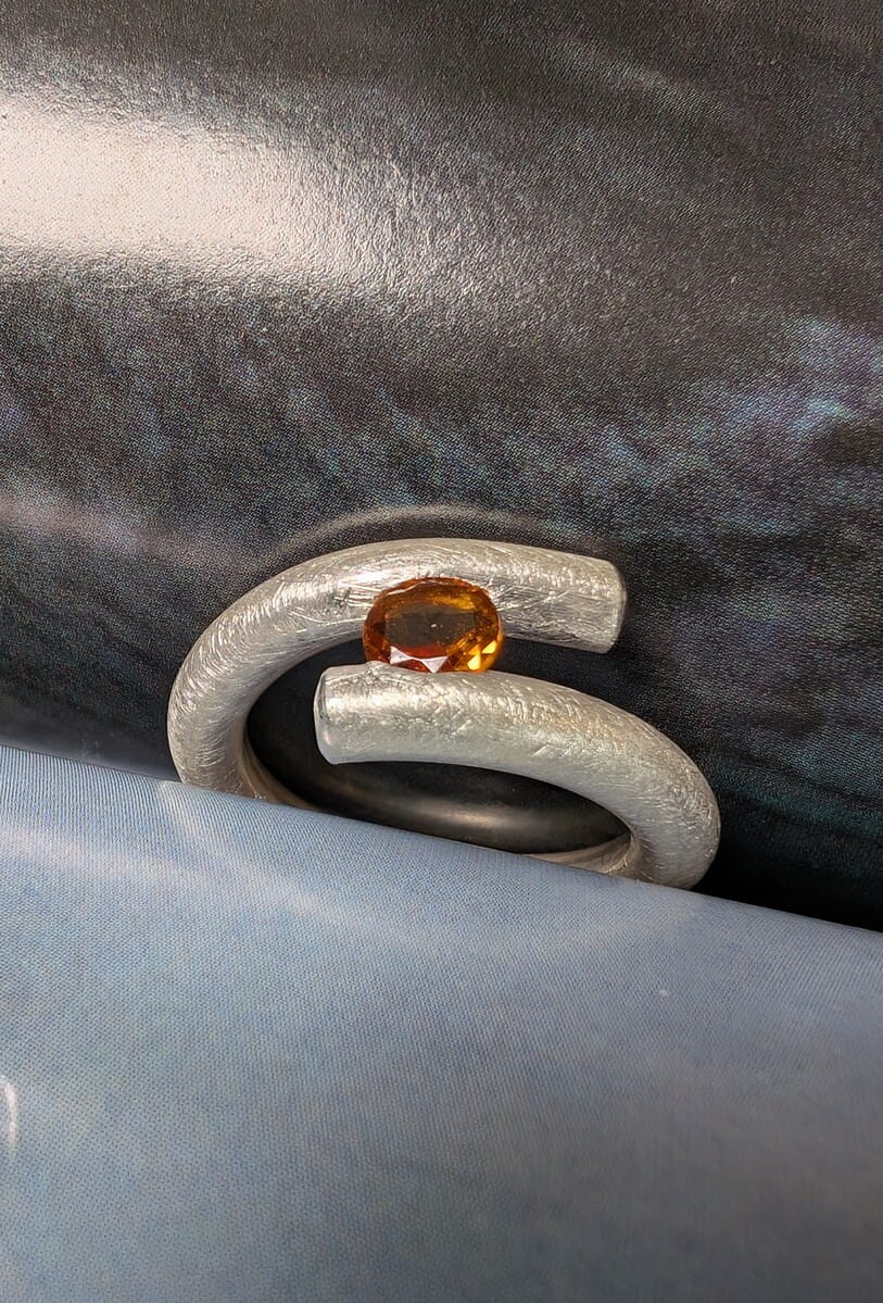 This modern tension-set ring features a round, faceted amber-colored gemstone, elegantly suspended within a brushed silver band. The innovative design creates the illusion that the gemstone is floating between the curved metal ends, highlighting expert craftsmanship and contemporary aesthetics. A perfect choice for those who appreciate unique jewelry, minimalist design, and sophisticated style.